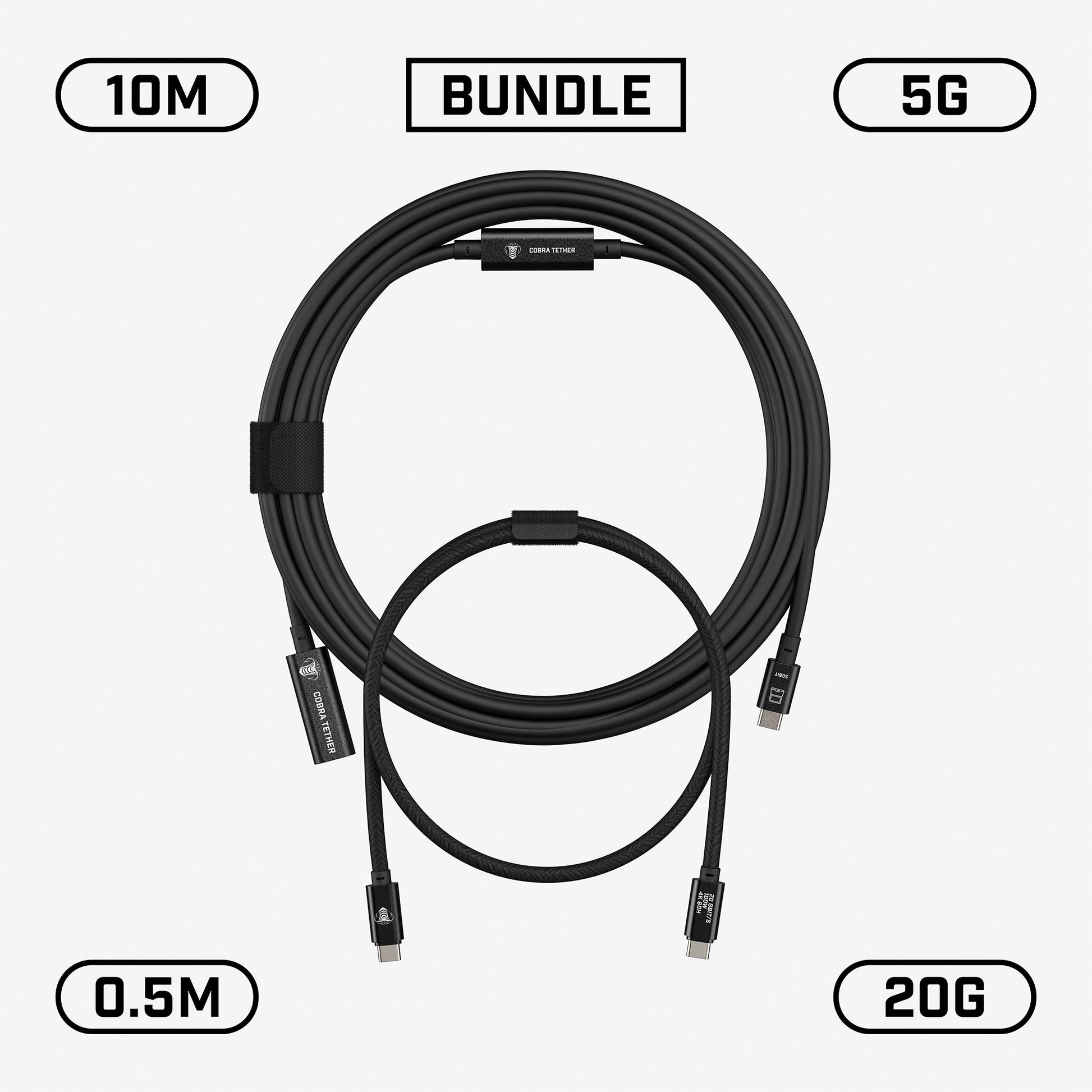This bundle combines our black 10M 5G USB-C extension cable with a 50cm 20G tether cable, creating the perfect setup for flexible workflows. Use the short 50cm cable as a pigtail on your camera for quick and easy disconnection from the workstation, while the 10m extension ensures reliable long-distance tethering. Ideal for professional photographers who need both stability and flexibility on set.